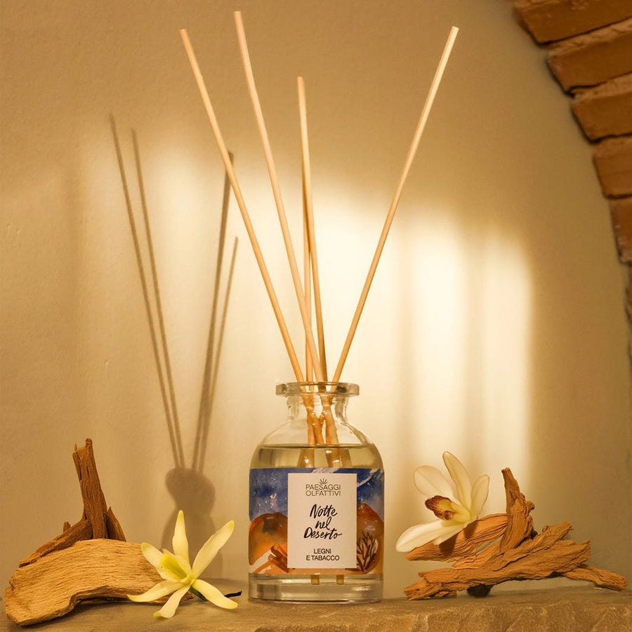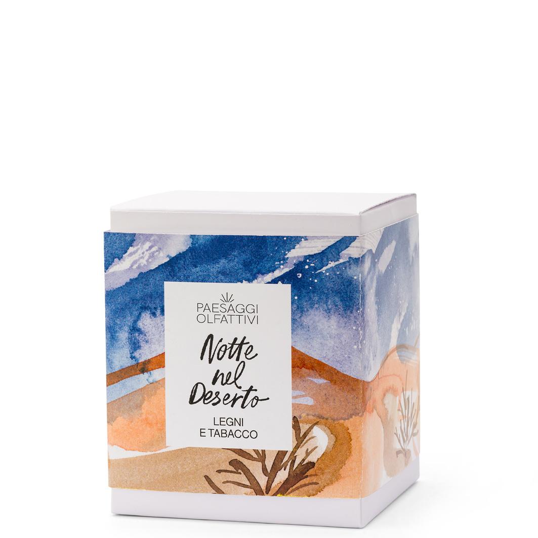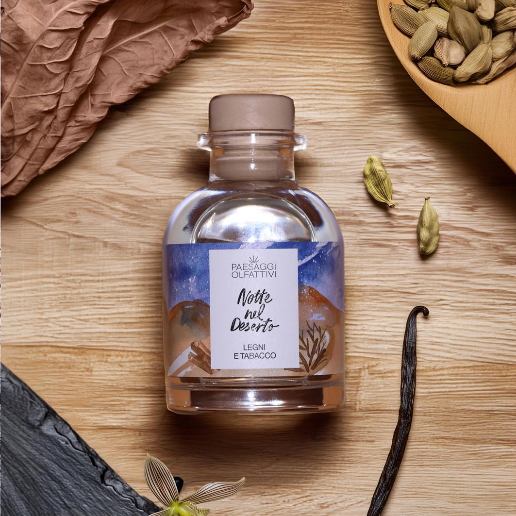 Notte nel Deserto evoca il silenzio stellato di dune ambrate e terre lontane. Le note di testa di legno di ebano, cedro e bergamotto introducono con un’ombra elegante e un tocco agrumato. Il cuore fonde legni nobili, resine e accenti caldi che si fondono in un’abbraccio sofisticato. Le note di fondo di note legnose e tabacco completano il percorso olfattivo con una scia profonda, avvolgente e persistente. È una fragranza perfetta per ambienti notturni o momenti intimi, in cui desideri un’atmosfera intensa e riservata.