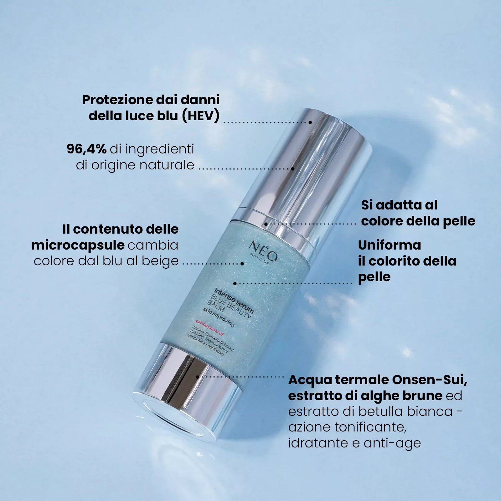 L’Intense Serum Blue Beauty Balm di Neo Make Up è un balsamo perfezionatore viso dalla sorprendente tonalità blu che, a contatto con il calore della pelle, si trasforma in una nuance beige adattandosi perfettamente all’incarnato. Formulato con il 96,4% di ingredienti di origine naturale e privo di siliconi, è il trattamento ideale per un make-up fresco e naturale, perfetto per l’uso quotidiano.