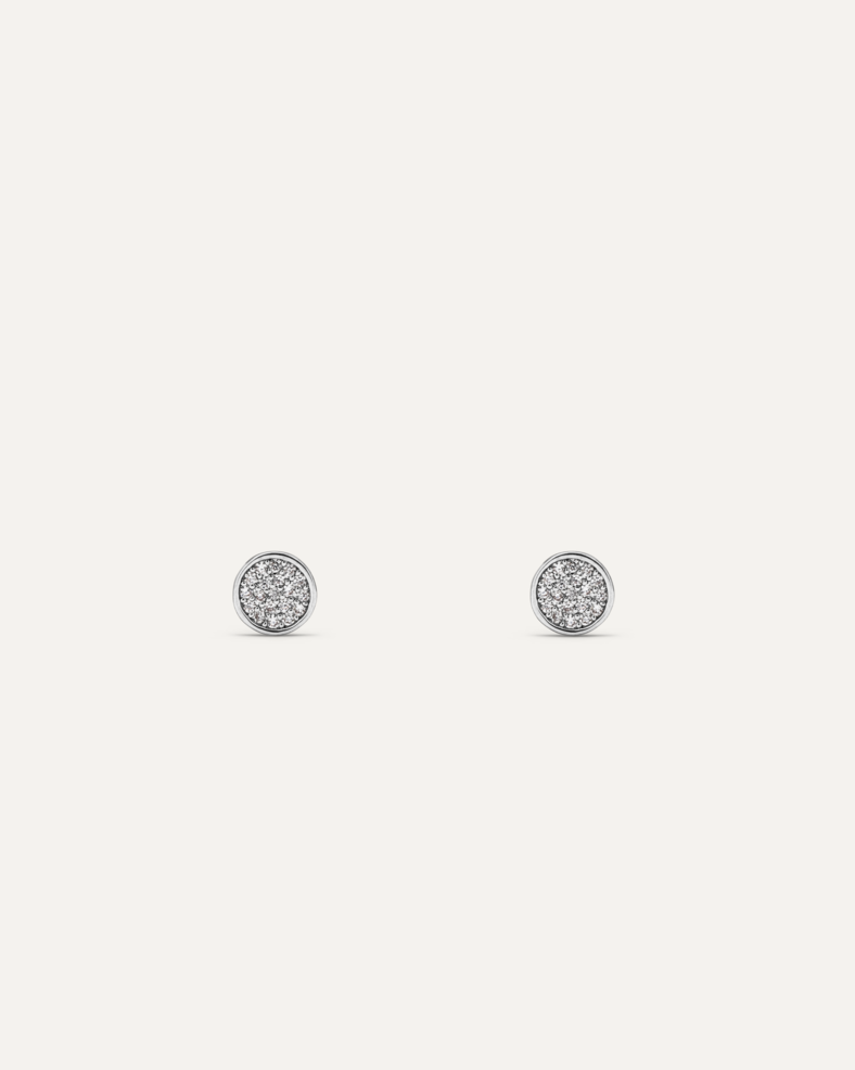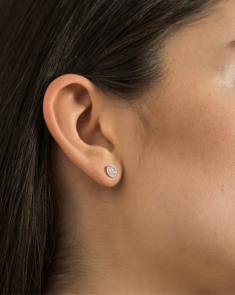 Orecchini a bottone con disco impreziosito da zirconi luminosi.